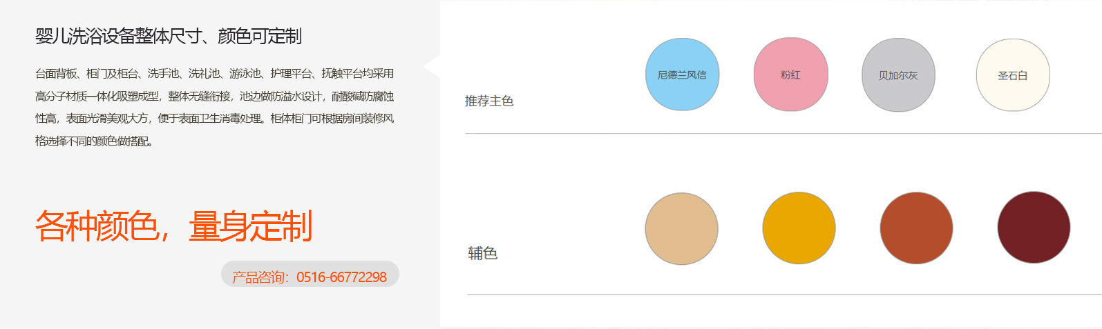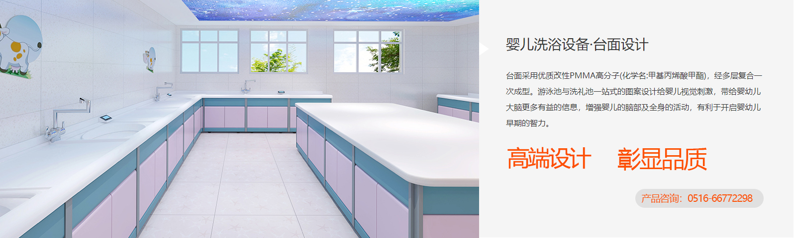 A.台面采用优质的改性PMMA高分子(化学名:甲基丙烯酸甲酯,远非普通亚克力及ABS复合材料可比),经多层复合成型。B.游泳池与洗礼池卡通式的图 案设计给婴幼儿更多的视觉刺激,带给婴幼儿大脑更多有益的信息,增强婴儿的脑部及全身的活动,有利于开启婴幼儿早期的智力。