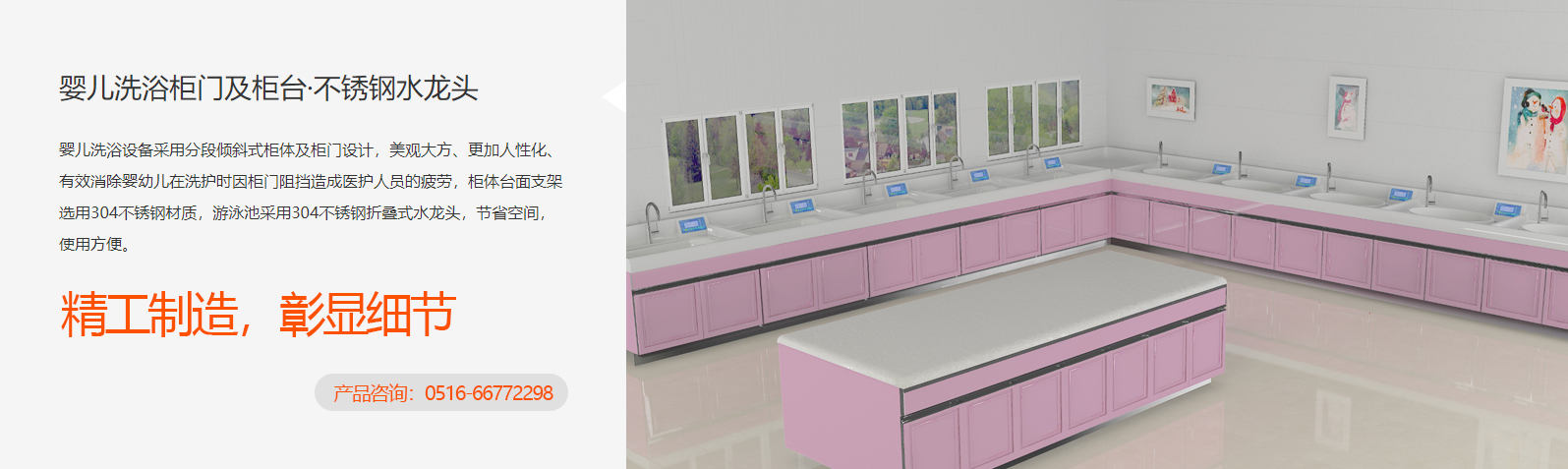 池内为适用婴儿洗澡设计了曲线模形,池上面可套防感染一次性塑料套,池边有防溢水导水沟及下水,有护理操作人员抗疲劳靠手设计,台面后端设有温控操作系统,池边设有洗澡用品放置专用区。