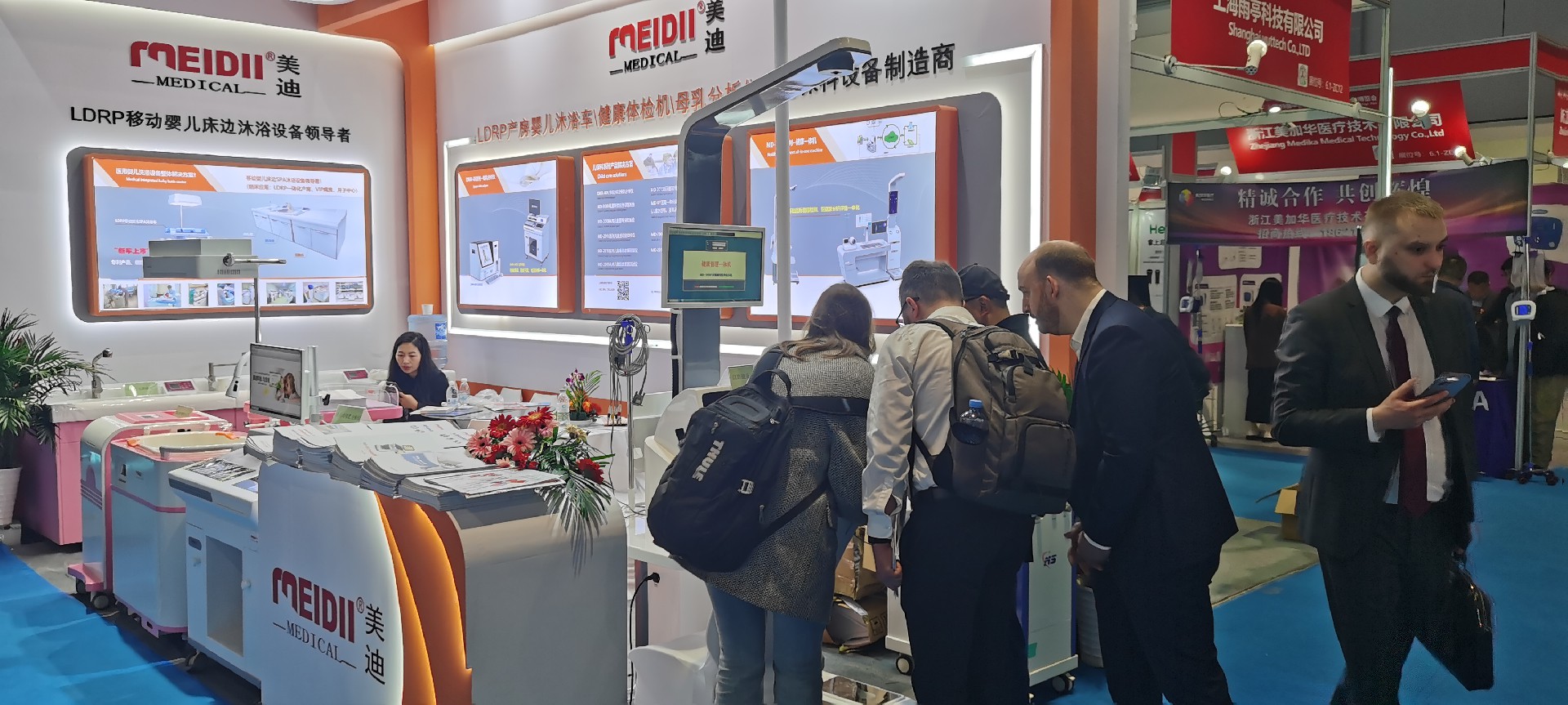 展会现场,美迪医疗展台人气爆棚,吸引了众多参展商和观众驻足咨询。热情地为参观者介绍产品的功能、特点和应用场景